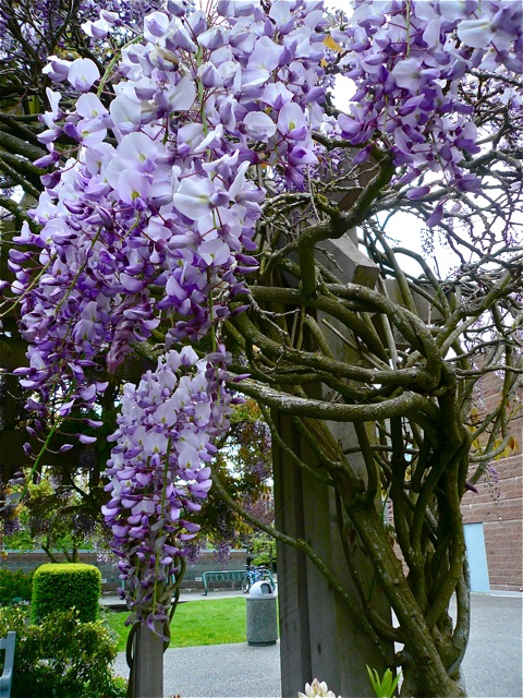 The flora on the UBC campus… the budding irises, hanging wisteria, exploding rhododendrons, and the unknown flowers and foliage (I’d appreciate your identifying them for me below the rhododendron)… and the sequestered Nitobe Japanese Garden: