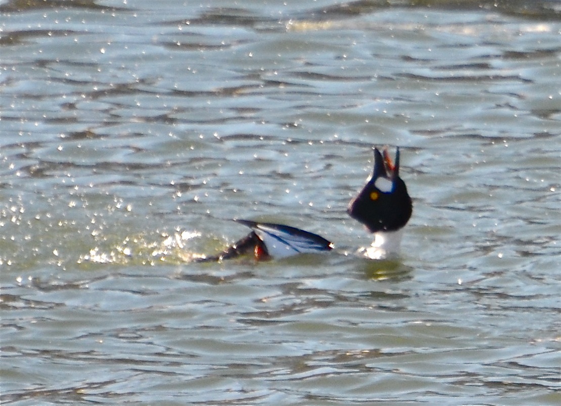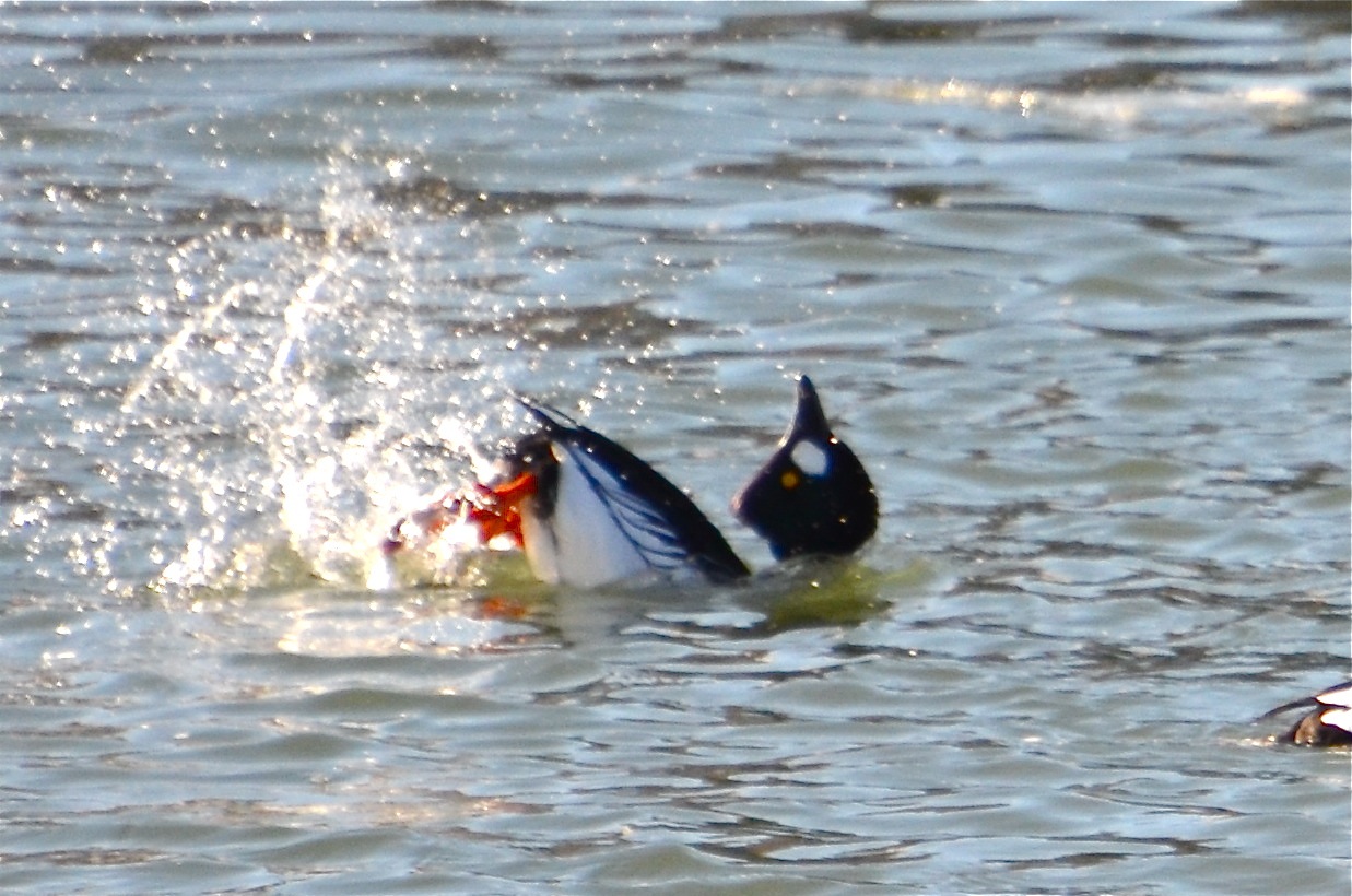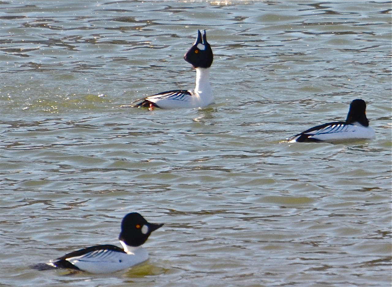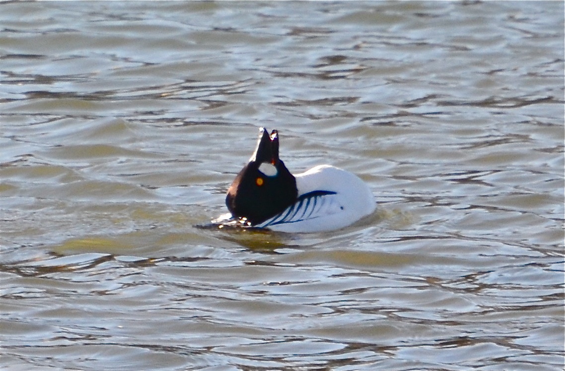 The photos of the goldeneyes are lovely, and you described their behavior perfectly. Our laughing gulls will do somewhat the same, except they get out of the water. Two or more males will stand facing one another on the docks, point their beaks up into the air and commence trying to outdo one another. It does sound like laughter. Sometimes they get so loud I can hear them from the lake, at least a mile away. Until everyone’s paired up, they gather in large groups, which only increases the noise.
