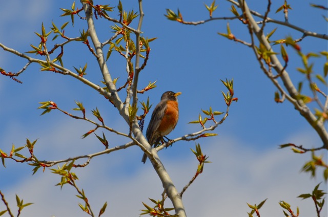 Here are some photos of what you can see within our budding grove. Probably the most common and easiest to photograph are the Robins. They like to pose and they are not too camera shy:
