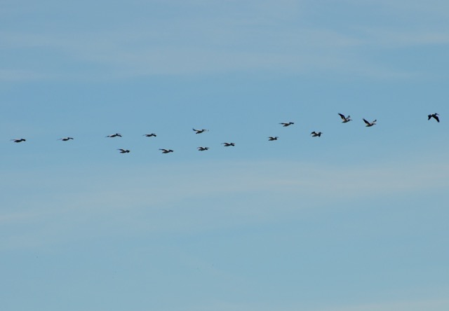 I’ve only seen the white ones here and they are beautiful. I suppose the brown ones look more like the Herons? Anyway, they are in migration mode. They’ll fly south soon I suppose, maybe to Florida. 😉