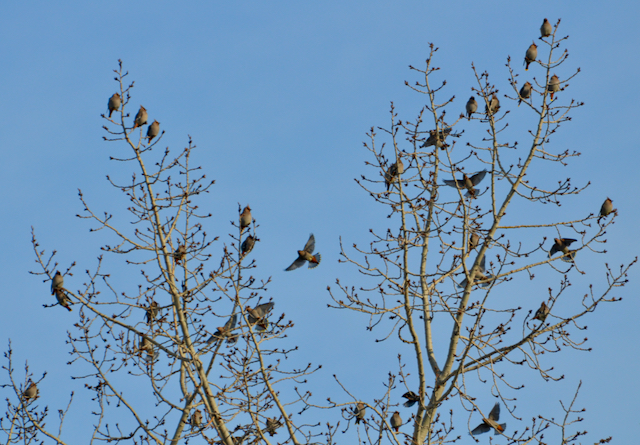 They are more plump in the body than the Cedar Waxwings, but with the same spiky crest and yellow-tipped tail. Don’t have anything closer than these photos as they were so far away.