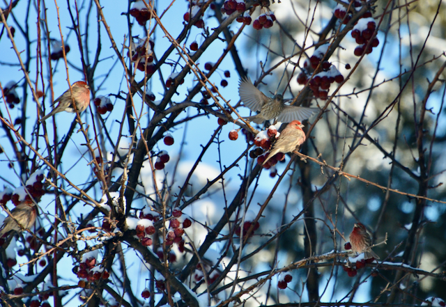 House Finches eating the remaining fruits on trees. Apparently not just for the food, but the drink. Never thought how birds in winter get their water from, since everything’s frozen. The snow, of course! Here they are taking in the snow. Not very clear picture, but you can see the snow on their beaks if you enlarge the pic. Trust me, they were feasting on the snow.