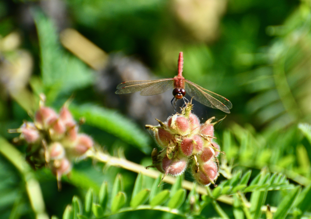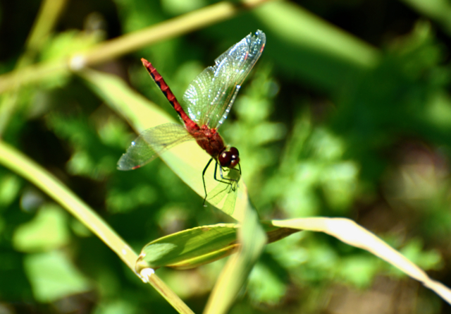 I’ve discovered a brand new interest. What are these red flying objects in front of my eyes, so many of them darting around. Red dragonflies… I haven’t noticed them before. My curiosity sent me to Google and yes, I’m sure they are dragonflies and not damselflies. The main difference is that dragonflies’ wings spread out like this when they’re at rest: