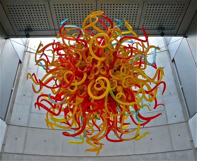At the reception building where we met to begin the tour, I discovered the work of another artist: Dale Chihuly’s glass work The Sun, suspended from the ceiling:
