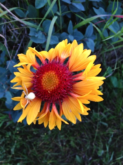 A white spider on a yellow flower:
