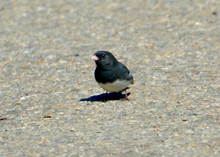 From afar, I knew that wasn’t a Chickadee or a Nuthatch, albeit about the same size but plumper. I took the picture and later looked it up. It was a Dark-eyed Junco. Sure I’ve heard of the junco before, but have never come face to face with one. I further found out that it was one of the most common birds in Canada. Oh really? This was the first time I saw it, and that made it special for me. Love that tiny pink beak.