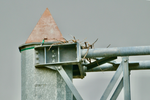 This year is different. Some human have chosen that exact spot to work on something. Not sure what they’re planning for the site. A lift equipment is nearby and a little wooden triangular structure has been erected, right where the Ospreys are building their home.