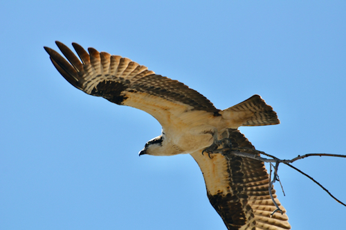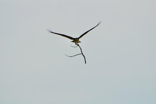 So there are two different building plans on the same site, but the Ospreys are undeterred. They haul in material from nearby trees, transporting one twig at a time.