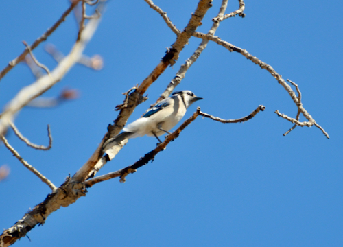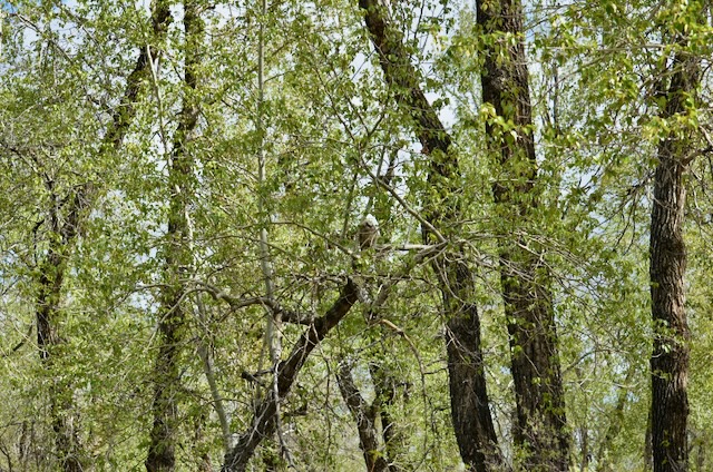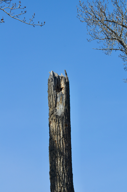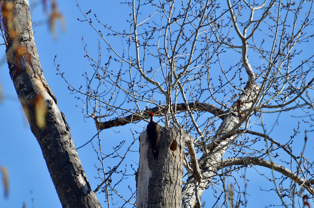 Yesterday was my first official spring birding. Soon as I stepped out of my car in the woods, I heard a loud peculiar call. I saw a large, black bird landing on top of a tree. One positive thing about a late start to spring for us is the bare branches. Surely, green leaves are warming to the eyes, but bare branches allow clearer views of birds. Can you see it?