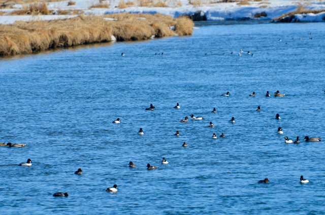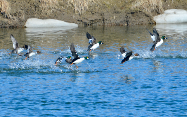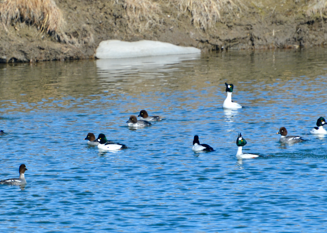 It’s courting season already. The male Goldeneyes doing their mating dance… stretching their necks upright and singing their tune. The females (brown heads) don’t seem too interested though:
